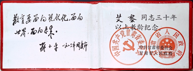 這是一本從教滿三十年的榮譽(yù)證書。由中共甘肅省委、甘肅省人民政府頒發(fā)。證書內(nèi)頁的左側(cè)是鄧小平1983年國慶節(jié)題寫的“教育要面向現(xiàn)代化,面向世界,面向未來”。右側(cè)是“艾黎同志三十年以上教齡紀(jì)念”。“三個(gè)面向”是為北京景山學(xué)校的題詞,是鄧小平提出的教育發(fā)展改革方針,旨在推動(dòng)中國的教育現(xiàn)代化進(jìn)程,使其更加開放和適應(yīng)未來發(fā)展的需要,面向世界,吸收國際先進(jìn)的教育理念和經(jīng)驗(yàn);同時(shí)展望未來,培養(yǎng)適應(yīng)未來社會(huì)需要的人才。