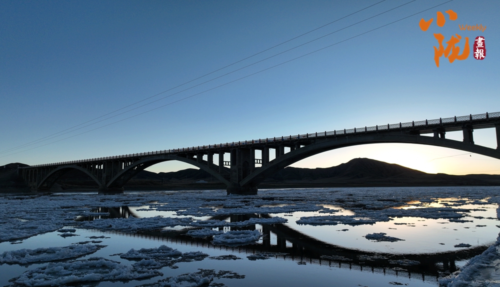 夕陽西下,冰凌隨著河水順流而下,互相碰撞,猶如珍珠瑪瑙般璀璨,鑲嵌在母親河的懷抱之中。