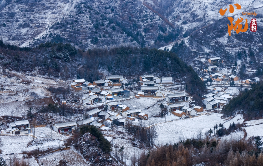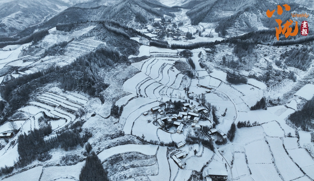 白雪皚皚、粉妝玉砌,群峰環(huán)抱田園山村,如同一幅水墨畫。