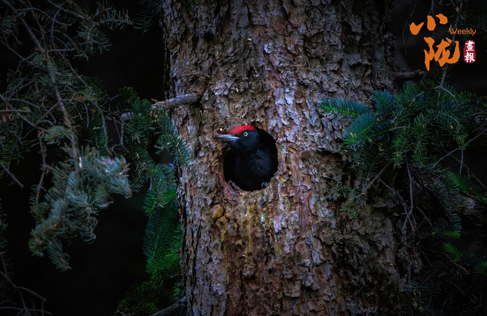 黑啄木鳥是一種大型的啄木鳥。它們的體長可達到45-50厘米,翼展可以達到65-75厘米,體重在250-350克之間。其外形非常有特色,它們的羽毛主要是黑色的,胸部和腹部有一些白色的斑點,頭部有一個紅色的冠羽,這是它們的顯著特征之一。黑啄木鳥的喙非常強壯,呈灰黑色,非常適合在樹木上啄洞。