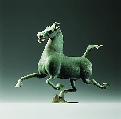 走進(jìn)甘肅省博物館,這匹東漢神駒,仿佛正在飛馳,攫住了所有人的目光——它全身呈流線型,肌肉健碩有力。它的口、眼、鼻均張開,三足騰空而起,一足踏于飛鳥之上,在飛鳥回首驚顧的一剎那,它已超越流星般飛行的鳥向前而去。馬的奔騰嘶鳴和風(fēng)的呼嘯猶在耳畔,這個(gè)風(fēng)馳電掣的瞬間也被定格成永恒。