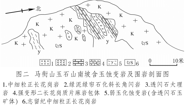 馬銜山玉礦分布在馬銜山東南部的玉石山(圖版一),海拔3028米。山上出露的地質(zhì)體主要為古元古界馬銜山巖群、中元古代片麻二長花崗質(zhì)巖[3]和志留紀(jì)正長花崗巖及正長巖。馬銜山巖群的巖性為黑云斜長片麻巖、變粒巖、斜長角閃巖和白云質(zhì)大理巖,巖石普遍遭受了韌性變形,變余糜稜巖發(fā)育。志留紀(jì)巖漿侵入期后熱液活動較強,石英脈細(xì)脈發(fā)育,局部見螢石礦化或礦床[4]。玉礦化主要產(chǎn)于馬銜山巖群與志留紀(jì)正長花崗巖和正長巖接觸帶上(圖版二),具體賦存在與白云質(zhì)大理巖的接觸部位,是正長花崗巖及正長巖與鎂質(zhì)大理巖接觸交代蝕變的產(chǎn)物[5]。花崗巖與片麻巖、變粒巖和斜長角閃巖接觸界線附近巖石雖有蝕變,但不見玉化蝕變巖或玉石出露。在近山頂開采玉石揭露的一個地質(zhì)剖面清晰地顯示了這些特征(圖二)。該剖面大致呈東西走向,長約50米,馬銜山巖群多呈殘留體出露,斜長角閃巖綠泥綠簾石化強烈,大理巖普遍發(fā)生蝕變,形成透輝透閃石大理巖,緊靠花崗巖接觸地帶發(fā)育窄窄的透閃石玉礦帶。現(xiàn)在人們找玉,也主要在該剖面上的花崗巖和鎂質(zhì)大理巖的接觸帶上鑿洞,在接觸帶上見有多處采挖玉石的洞穴。在該剖面西側(cè)約50米,發(fā)育有正長巖與大理巖的混染帶,肉紅色正長巖中包裹混染著大量灰綠色透閃透輝大理巖,部分已蝕變?yōu)橥搁W透輝石巖,且質(zhì)地較細(xì)膩,成為半玉化巖石。剖面和周圍地質(zhì)特征表明,玉礦的形成是早古生代志留紀(jì)花崗質(zhì)雜巖體侵入到古元古代鎂質(zhì)大理巖,發(fā)生接觸交代蝕變作用的結(jié)果,在兩種巖石接觸帶形成玉礦體。但并不是蝕變帶中的巖石都是透閃石玉石,透閃石玉在蝕變帶中多呈雞窩狀或不規(guī)則狀分布,少量呈脈狀出露。從剖面及部分采坑的規(guī)模來看,玉礦體向深處有變大、變好的趨勢,這主要受控于接觸面產(chǎn)狀,在傾角較緩處礦體相對較大。橫向上在背離接觸面方向圍巖具有從透閃石玉到透閃透輝石玉、透閃透輝石大理巖再到含透閃石大理巖的變化特征,反映了交代蝕變強度與接觸帶溫度及熱液成分變化的密切關(guān)系。從玉礦體到蝕變圍巖由于成分和結(jié)構(gòu)的變化出現(xiàn)一系列不同類型的玉石或巖石。我們在剖面上采集到一些小塊的淡綠色玉料(圖版三)和出露較寬的微晶大理巖,經(jīng)偏光顯微鏡下薄片鑒定和XRF檢測,確定有透閃石玉、透輝透閃玉、透閃透輝石玉、透閃透輝石大理巖和含透閃石大理巖等,這與馬家窯遺址出土的齊家文化時期大部分玉質(zhì)品玉料類型基本一致[6]。部分地段近礦圍巖還有透輝石巖、透輝矽卡巖、矽卡巖化大理巖、蛇紋石化大理巖、斜長透輝石巖等。玉石山的采洞(坑)由于資源與環(huán)境保護(hù)的要求,大多已被填埋,但仍可見采坑殘留的位置。采洞(坑)均位于大理巖與正長花崗巖接觸帶靠近大理巖一側(cè),這也間接顯示了玉礦體的位置。此外,玉石山花崗巖中石英細(xì)脈較發(fā)育,局部可見螢石礦化,反映了花崗巖侵入期后低溫?zé)嵋夯顒尤暂^強,對玉礦也有一定的改造影響。