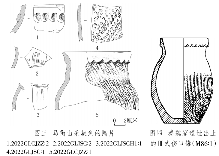 陶片 2片,2022GLCJZZ∶1,罐殘片,夾砂紅陶,腹部以下缺失。侈口,上有煙熏痕跡。短頸,頸上部有一圈鋸齒狀凸飾,鼓腹,頸部和腹部滿飾粗繩紋。復(fù)原口徑12、器壁厚0.6~1、殘高10厘米(圖三,5)。與秦魏家遺址出土的齊家文化Ⅲ式侈口罐(圖四)[16]形制相似。2022GLCJZZ∶2,罐口沿殘片,夾砂紅陶。口沿下有月牙狀附加堆紋??谘貧堥L5.3、殘高4.8、厚0.7厘米(圖三,1)。