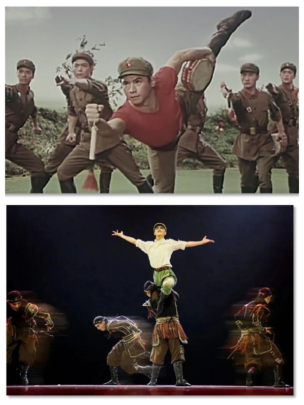 當(dāng)小戰(zhàn)士王虎在連長的幫助下終于成功馴服戰(zhàn)馬時,采用了托舉技巧,小戰(zhàn)士王虎以連長的腿作為支撐點,在戰(zhàn)友的包圍下成功御馬。托舉表現(xiàn)出官兵互幫互助、團(tuán)結(jié)友愛的軍隊氛圍。值得注意的是,創(chuàng)作者運(yùn)用了虛實結(jié)合的表現(xiàn)手法,作品中并未出現(xiàn)真實的戰(zhàn)馬,全靠演員的動作身姿展現(xiàn)。“無馬之馬”的背后,是中國傳統(tǒng)美學(xué)藝術(shù)中“虛實結(jié)合”的哲學(xué)意涵。袁禾教授在論及中國舞蹈美學(xué)時指出:“虛與實本是中國哲學(xué)的一對范疇,具體到舞蹈中,形成了一整套從觀念到創(chuàng)作、從表演到欣賞的美學(xué)原則”。當(dāng)小戰(zhàn)士王虎調(diào)教烈馬時,演員的肢體既是人體之實,又是馬匹之虛;既是具象的馴馬動作,又是抽象的意志較量,人與馬在舞蹈中實現(xiàn)了身體和精神的高度統(tǒng)一。