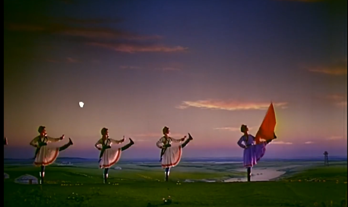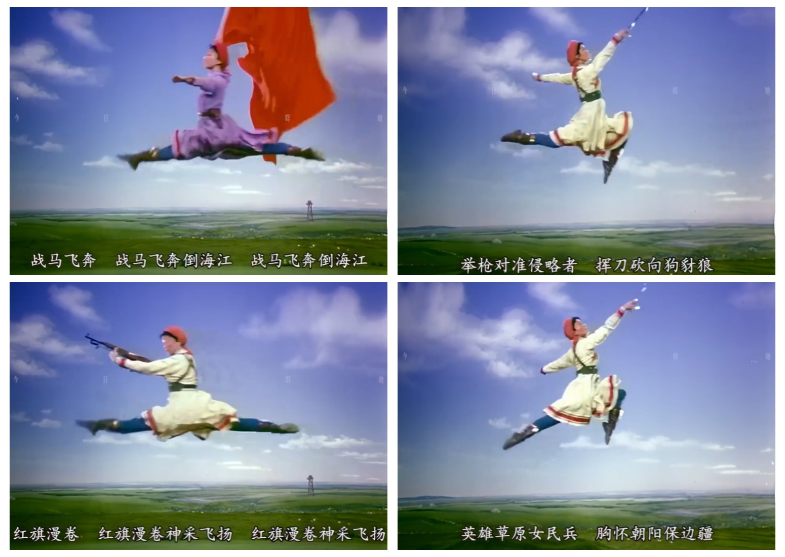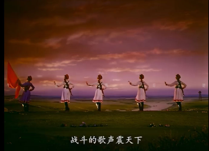 《草原女民兵》最初作為舞臺(tái)舞蹈,其美學(xué)特質(zhì)建立在現(xiàn)場(chǎng)性、即時(shí)性與三維空間性之上。而當(dāng)它通過(guò)《百花爭(zhēng)艷》的鏡頭被重新詮釋時(shí),經(jīng)歷了一場(chǎng)深刻的美學(xué)轉(zhuǎn)換。電影不僅記錄了這一舞蹈,更通過(guò)其特有的語(yǔ)言系統(tǒng),對(duì)舞蹈進(jìn)行了二次創(chuàng)作與美學(xué)升華。