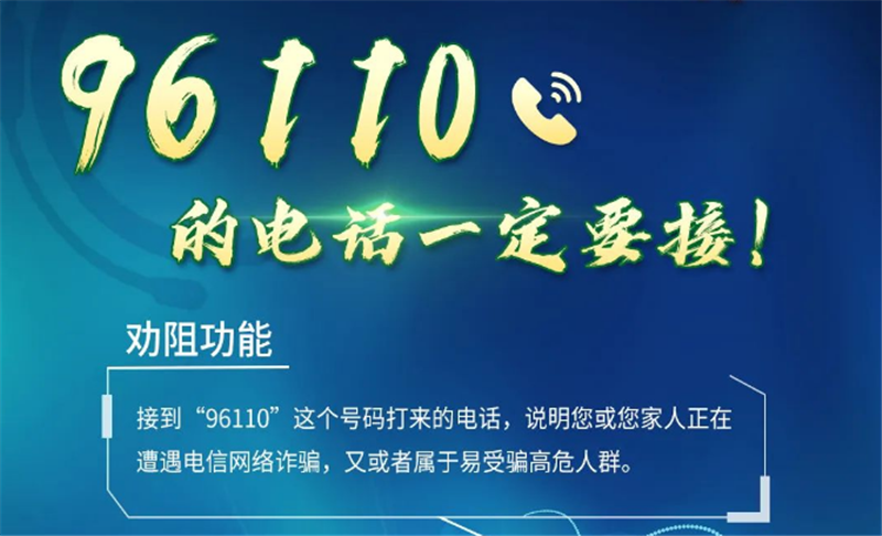 公安機關提醒:96110是官方預警勸阻專線,如接到“96110”號碼來電,說明機主本人或其家人正遭遇電信網絡詐騙,請一定及時接聽并耐心聽取民警的勸阻提示,避免上當受騙。