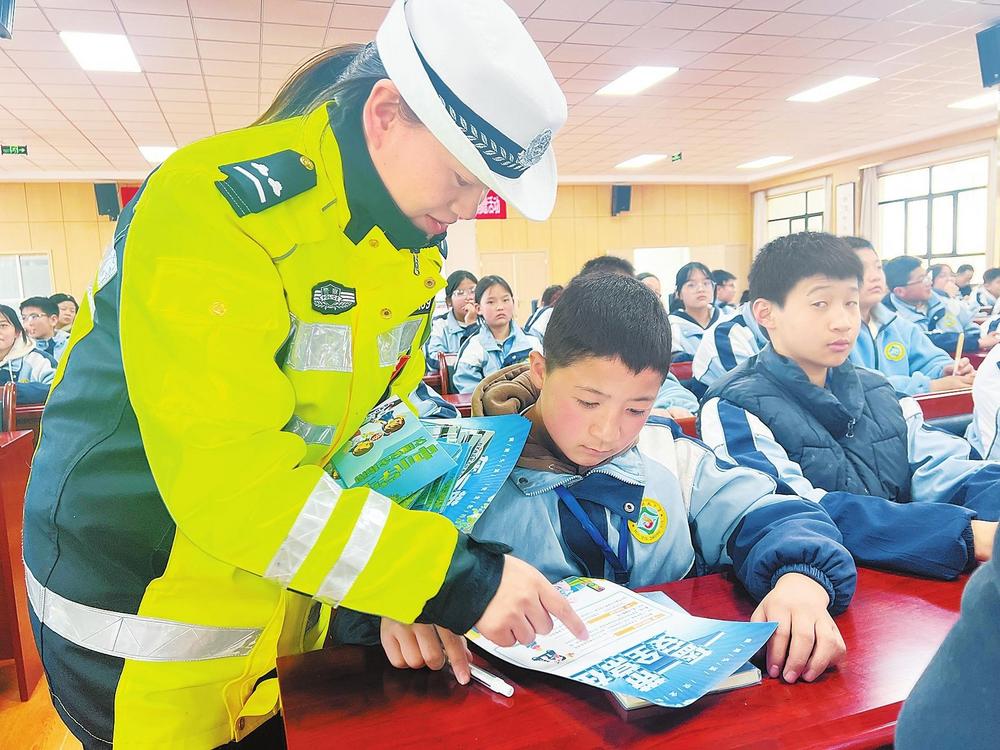 民警向?qū)W生講解交通安全知識。2月26日,臨潭縣公安局交警大隊(duì)組織民警走進(jìn)臨潭縣回民中學(xué),開展交通安全進(jìn)校園宣傳活動(dòng)。 新甘肅·甘肅法治報(bào)記者金凡裕攝