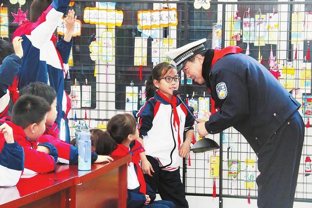 民警與同學(xué)生互動(dòng)交流。2月26日,蘭州市公安局交警支隊(duì)紅古大隊(duì)民警走進(jìn)學(xué)校,開展“小手牽大手”交通安全宣傳活動(dòng)。新甘肅·甘肅法治報(bào)記者王輝攝