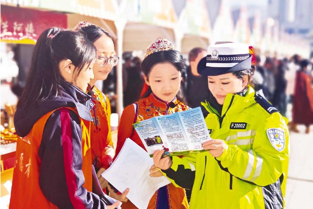 民警向群眾講解交通安全知識(shí)。11月27日,廣河縣公安局交管大隊(duì)民警走進(jìn)齊家文化廣場(chǎng),利用戲曲進(jìn)鄉(xiāng)村文藝匯演的有利契機(jī)開展交通安全系列宣傳活動(dòng)。新甘肅·甘肅法治報(bào)通訊員 汪洋 攝