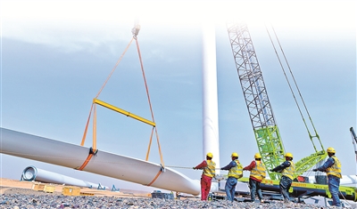 甘肅省高臺(tái)縣境內(nèi)有戈壁荒漠2000多平方公里,近年來憑借風(fēng)光資源優(yōu)勢,發(fā)力新能源產(chǎn)業(yè)賽道。圖為該縣某新能源風(fēng)力發(fā)電項(xiàng)目建設(shè)現(xiàn)場,工作人員正在安裝風(fēng)力發(fā)電機(jī)。新華社發(fā)