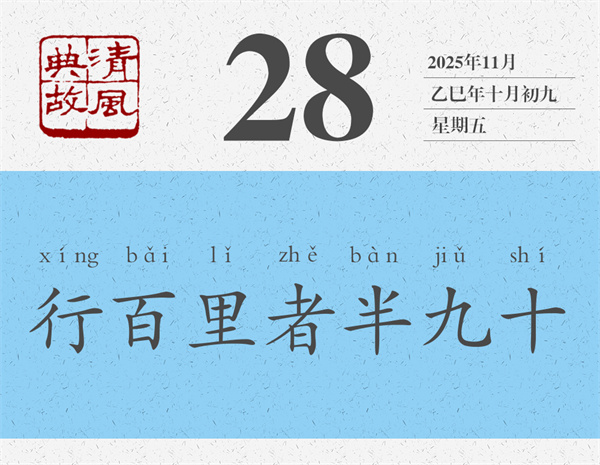 《戰(zhàn)國(guó)策·秦策五》中有一句無(wú)名說(shuō)客規(guī)勸秦王的話(huà):“詩(shī)云:‘行百里者半于九十’,此言末路之難也。”這里的“詩(shī)云”,不是我們平常所說(shuō)的“子曰詩(shī)云”中的“詩(shī)云”。只是一個(gè)連姓名都沒(méi)留下的作者留下的一首詩(shī)中的句子:“行百里者,半于九十。”字面意思是:如果要走一百里路,走到九十里才算走了一半。這是怎么回事呢?這里說(shuō)的不是算術(shù)問(wèn)題,而是說(shuō)最后一段路程總是十分艱難,走完它需要付出更多的努力。