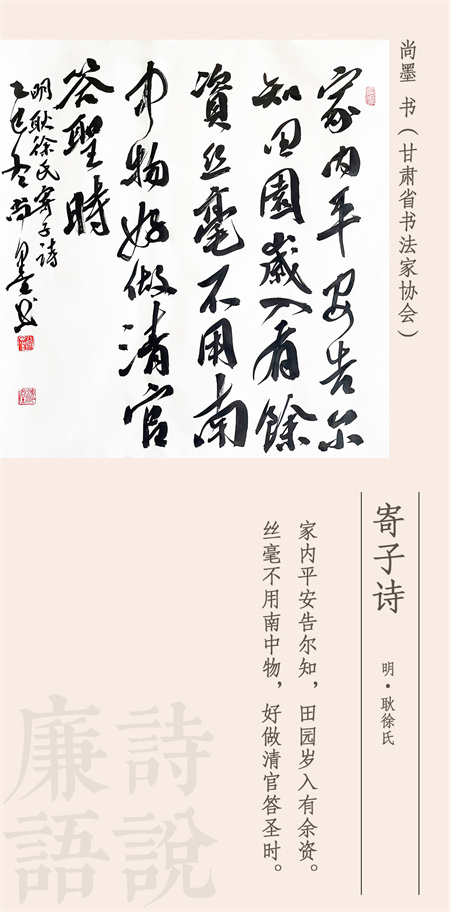 耿庭柏少年得志,20歲即中進士、任知縣,可謂春風(fēng)得意。但耿徐氏卻并沒有一味沉溺于兒子帶來的榮耀,而是很冷靜、及時地寫了這首詩寄給他,給予諄諄告誡。詩句很平實,意思很明確,家中一切都好,田園的收入完全能夠養(yǎng)活家人。所以山陰(即今紹興)這個富庶之地的一絲一毫你都不可非法攫取來寄給我,只要你好好地做個清官來報答國家和黎民就足夠了。這首詩當(dāng)時即傳誦一時,后來還被收入清代沈德潛編纂的《明詩別裁集》、宋弼編纂的《山左明詩鈔》等詩歌選集中。耿家為書香門第,科甲鼎盛,先后出過七個進士,但他們的詩詞作品都沒有流傳下來,反而是耿徐氏的這首詩為家族撐了門面。