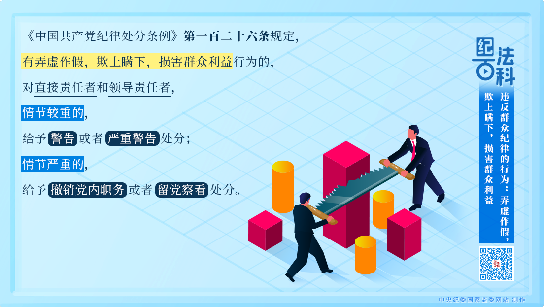 《中國共產黨紀律處分條例》第一百二十六條規(guī)定,有弄虛作假,欺上瞞下,損害群眾利益行為的,對直接責任者和領導責任者,情節(jié)較重的,給予警告或者嚴重警告處分;情節(jié)嚴重的,給予撤銷黨內職務或者留黨察看處分。