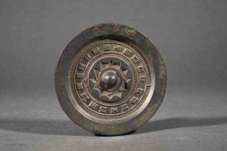 漢代,直徑9.7厘米。半圓形背鈕,鈕周飾連弧紋,外圈一周銘文,背沿寬平。銅鏡正衣冠、明是非,“昭明”即“內(nèi)清質(zhì)以昭明,光輝象夫日月”,以潔凈光明的鏡面為象征,表達(dá)了人們潔身自好的精神追求。