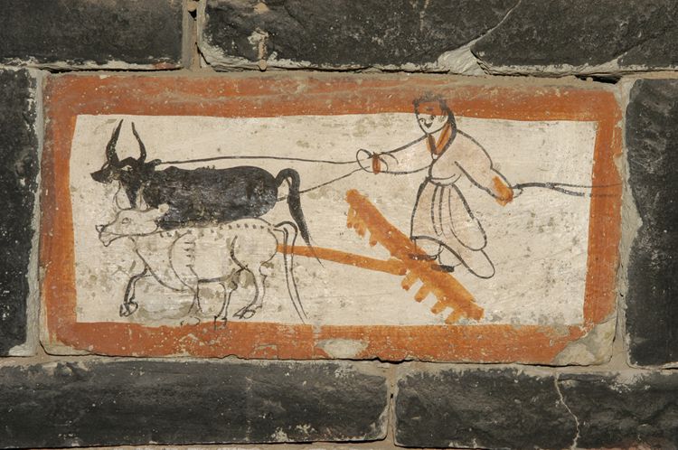 魏晉時期,嘉峪關市新城魏晉5號墓出土。長35.5厘米,寬17厘米。磚呈長方形,白粉涂底,土紅色勾勒邊框,墨線描繪,紅、黑色敷彩。畫面繪一男子身著紅領右衽長袍,左手持鞭,右手持繩,站于二牛抬杠耙上耙地。黑?;厥追搭?,白牛用力前行,共拉紅色齒耙。