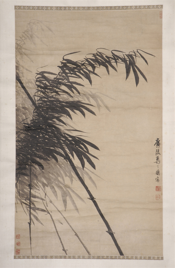 清代,縱高102厘米,橫寬60厘米。作者運(yùn)筆逆來順往,橫涂豎抹,濃墨勾節(jié),淡墨寫葉,濃淡相生。在疾風(fēng)的鼓蕩下,健竹一竿逆風(fēng)巋然,嫩竹三枝不彎不揖,枝葉順風(fēng)飛揚(yáng)而不折。禹之鼎,字尚吉,一字尚基,號慎齋。廣陵(今江蘇興化)人,后寄籍江都(今江蘇揚(yáng)州)。清康熙二十年(1681年)官鴻臚寺序班,以畫供奉入暢春園。善畫人物、山水,尤精寫真。