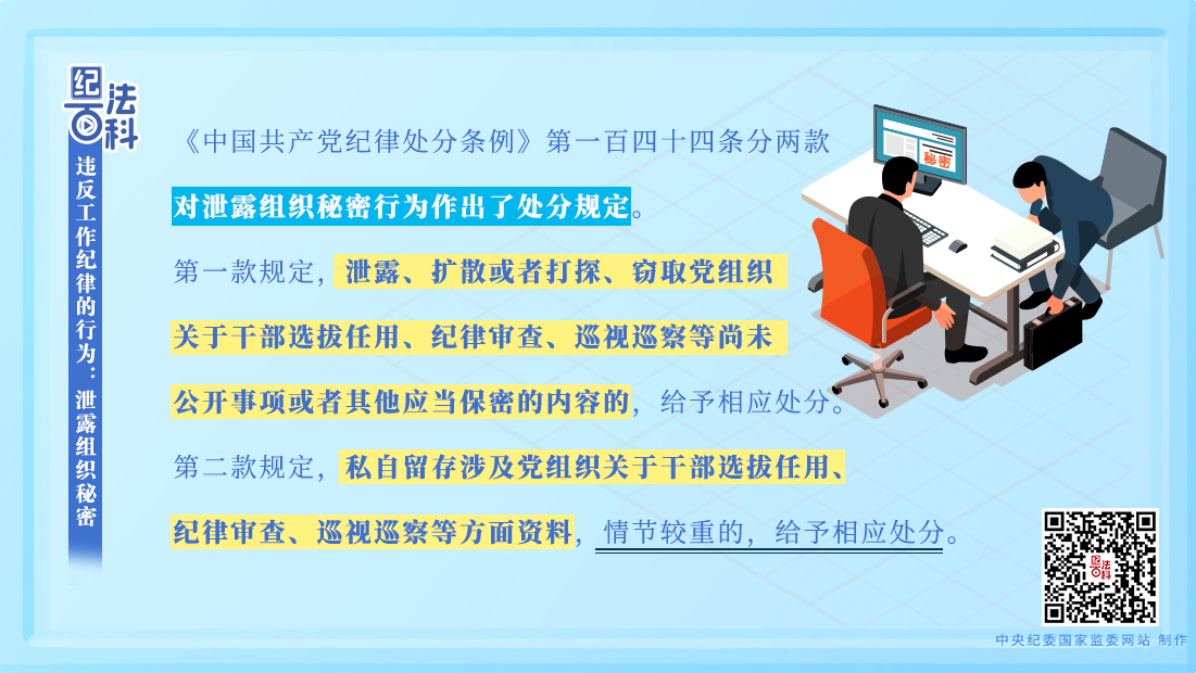 “嚴(yán)守黨的紀(jì)律,保守黨的秘密”,是每名黨員入黨宣誓時的鄭重承諾。無論選人用人工作、紀(jì)律審查工作,還是巡視巡察等工作,都有嚴(yán)格的保密紀(jì)律?!饵h政領(lǐng)導(dǎo)干部選拔任用工作條例》規(guī)定,選拔任用黨政領(lǐng)導(dǎo)干部,不準(zhǔn)私自泄露研判、動議、民主推薦、民主測評、考察、醞釀、討論決定干部等有關(guān)情況?!吨袊伯a(chǎn)黨紀(jì)律檢查機關(guān)監(jiān)督執(zhí)紀(jì)工作規(guī)則》規(guī)定,監(jiān)督執(zhí)紀(jì)人員不準(zhǔn)私自留存問題線索和涉案資料,嚴(yán)禁泄露審查調(diào)查工作情況,對紀(jì)檢干部私存線索、跑風(fēng)漏氣、違反安全保密規(guī)定等違紀(jì)行為要嚴(yán)肅處理?!吨袊伯a(chǎn)黨巡視工作條例》規(guī)定,巡視工作人員私自留存巡視工作資料,泄露與巡視工作有關(guān)的未公開信息的,要給予處理處分。