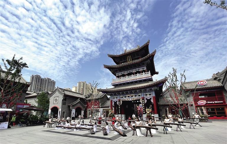 中國甘肅網(wǎng)6月28日訊 據(jù)蘭州日報報道(記者 李沛珂 攝)6月27日,由《蘭州日報》、西北民族大學、蘭州老街共同發(fā)起的“數(shù)箏齊奏頌黨恩”活動在蘭州老街舉行。來自西北民族大學音樂學院古箏專業(yè)“明·凈“箏團的40多位師生,齊奏《我的祖國》、《盛世國樂》、《唱支山歌給黨聽》等耳熟能詳?shù)慕?jīng)典曲目,吸引路過的市民紛紛駐足圍觀,贏得陣陣掌聲。