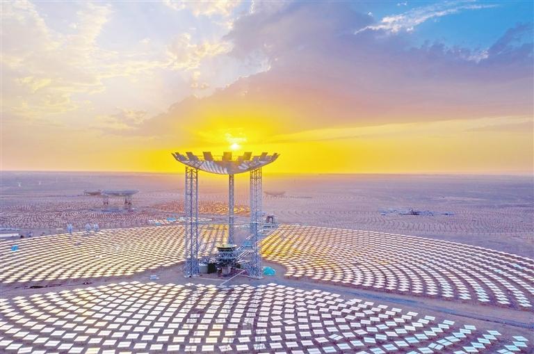 一排排風(fēng)電機(jī)組整齊列陣迎風(fēng)旋轉(zhuǎn),蔚然壯觀;成片的光伏板將茫茫戈壁裝點成浩瀚的藍(lán)色海洋,熠熠生輝;上萬塊定日鏡和吸熱塔構(gòu)成超級鏡子發(fā)電站,耀眼且震撼。
