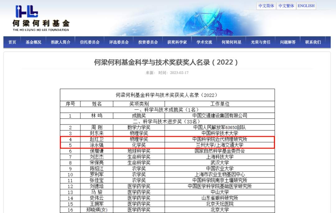日前,何梁何利基金2021和2022年度頒獎(jiǎng)大會在北京舉行,共授予112名杰出科技工作者。其中,中國科學(xué)院近代物理研究所趙紅衛(wèi)、蘭州大學(xué)涂永強(qiáng)榮獲2022年度何梁何利基金科學(xué)與技術(shù)進(jìn)步獎(jiǎng)。