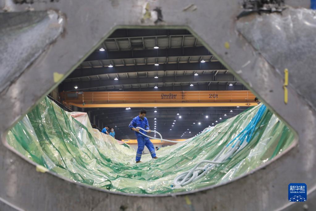 2月17日,在酒泉經(jīng)濟(jì)技術(shù)開(kāi)發(fā)區(qū)的一家風(fēng)電葉片制造企業(yè),工人在風(fēng)機(jī)葉片生產(chǎn)線為葉片灌注做準(zhǔn)備。