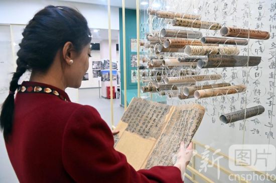 3月14日,敦煌研究院敦煌文獻研究所所長趙曉星接受中新社記者專訪介紹稱,全彩印《敦煌文獻全集》出版工作已正式啟動,該叢書采用全彩印的方式刊布敦煌文獻,實現(xiàn)敦煌文獻在線下圖錄中的高清還原。敦煌文獻,又稱敦煌遺書,是指1900年在甘肅敦煌莫高窟藏經(jīng)洞發(fā)現(xiàn)的公元4世紀至11世紀的寫本、印本和拓片等文獻。據(jù)最新統(tǒng)計顯示,其總數(shù)近7萬件。目前這些文獻分藏于中、英、法、俄、日等國的數(shù)十家收藏機構(gòu),一直缺乏完整的聯(lián)合目錄。圖為3月3日,工作人員在敦煌藝術館卷軸墻前閱覽敦煌遺書影印品。 中新社記者 九美旦增 攝