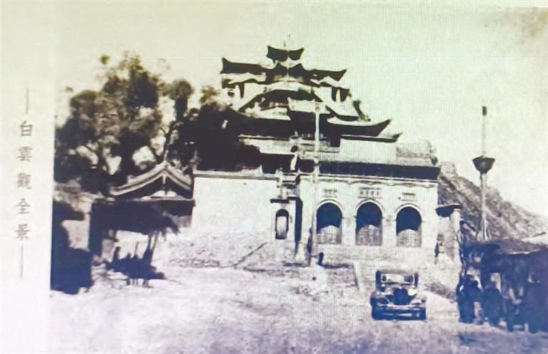 1935年5月,邵元沖考察西北途經(jīng)蘭州,專程赴崔家崖白云觀參訪?!段鞅彪S軺記》載:“依極壽山麓,建白云觀,高三百余級,黃流襟帶,榆柳成蔭,書長無事,凝坐其間,聆水聲潺湲,聽鳥語啾啁,亦足滌塵煩,消炎夏。”邵元沖為此特作《題崔家崖白云觀》詩曰:“玄都峙重崖,清磬林間響。俯瞰大河橫,寒流走混□。柳晚翠煙浮,閑云獨(dú)來往。”《西北攬勝》一書中,專門刊載兩幅崔家崖白云觀照片,照片說明曰:“北臨黃河,南接蘭山,形勢雄壯,殿宇倚坡上筑,宏麗精巧,且曲徑回廊,引人入勝,亦蘭垣名勝之一也。” 從老照片中可見,崔家崖白云觀依山而建,頗具氣勢,而且交通便利,邵元沖一行乘坐的小汽車可以直達(dá)觀前。