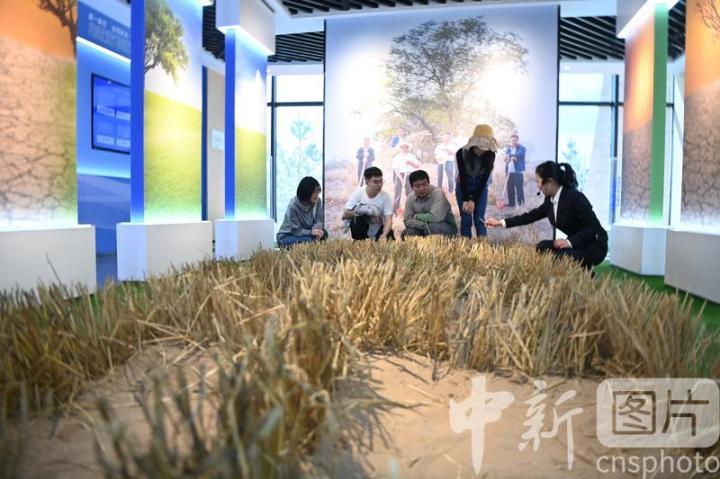 4月16日,甘肅省武威市古浪縣,學(xué)生們在八步沙兩山實踐創(chuàng)新基地參觀了解當?shù)靥禺a(chǎn)。