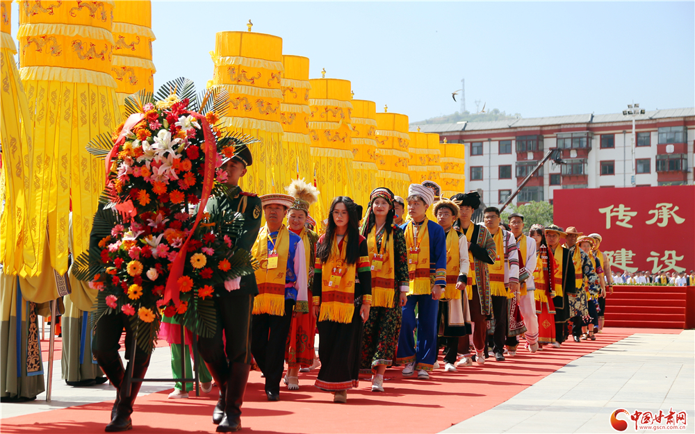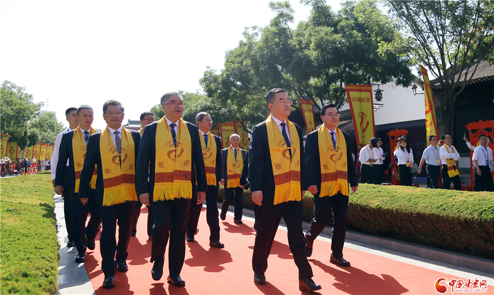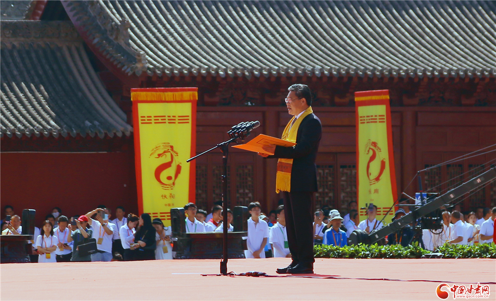 隴山蒼蒼,渭水泱泱。羲皇勛德,日月齊光。福佑中華,龍脈永昌。爰成斯禮,敬奠瓊漿。公祭儀式上,中共甘肅省委副書記、省長任振鶴恭讀祭文,所有來賓面向伏羲廟方向三鞠躬敬祭。