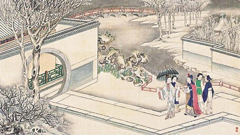著名紅學(xué)家周汝昌曾評(píng)論清代孫溫《紅樓夢(mèng)》繪本是“紅樓瑰寶”,其中一處細(xì)節(jié)就配得上這種評(píng)論。賈政攜寶玉和眾客游覽大觀園的繪制中,孫溫用了13幅畫并以焦點(diǎn)游移的手法,一路將賈政等人的路線詳細(xì)描繪出來(lái),跟著畫面而走,觀者可以看到瀟湘館、蘅蕪院、沁芳亭、沁芳橋等大觀園景觀,令人嘆為觀止。