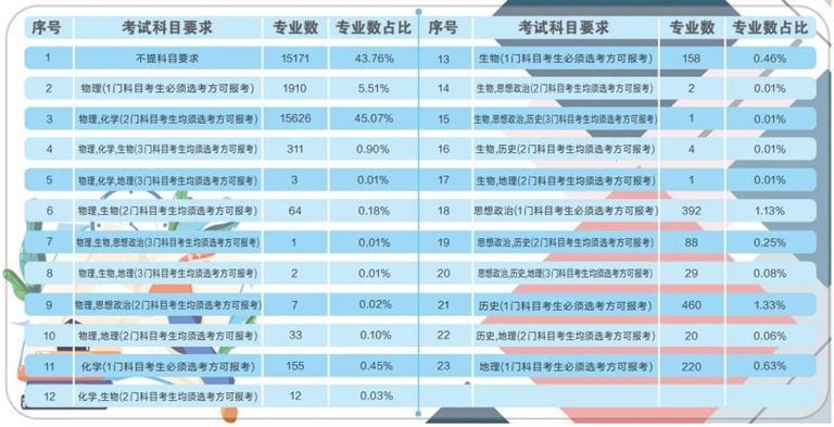 據(jù)了解,根據(jù)《甘肅省深化高等學(xué)校考試招生綜合改革實(shí)施方案》要求,從 2021年秋季入學(xué)的普通高中一年級學(xué)生開始,實(shí)行基于統(tǒng)一高考和高中學(xué)業(yè)水平考試成績、參考綜合素質(zhì)評價(jià)的高校考試招生模式。到2024年,基本形成分類考試、綜合評價(jià)、多元錄取的高校考試招生制度,健全促進(jìn)公平、科學(xué)選才、監(jiān)督有力的高校考試招生體制機(jī)制。此次在我省報(bào)送選考科目要求的高校專業(yè)共計(jì)64092條,其中本科專業(yè)34670條。專業(yè)選考科目要求共有23種組合,其中不提科目要求的本科專業(yè)數(shù)量占本科專業(yè)總數(shù)的43.76%,含物理科目的占比為51.79%,含化學(xué)科目的占比為46.46%,含歷史科目的占比為1.74%,含“物理+化學(xué)”科目的占比為45.98%。