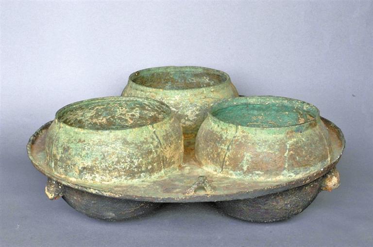1979年,靈臺縣獨(dú)店鎮(zhèn)中慶村飲馬嘴漢墓出土了一件類似火鍋的連體三釜銅灶。通高16.4厘米,釜口徑分別為17厘米、17.4厘米、16.7厘米。三連釜,用九塊范鑄成。三釜均斂口,圓唇,球腹,圜底。圓盤窄沿,盤面近沿處分別置三個三角形掛鈕,盤下三釜外側(cè)各有一支釘,釜底有煙炱。從盤面間三系看,可供吊掛,盤陰三個支臺,可用于支撐,顯然有流動使用的功能。三個釜可同時烹煮不同食物,圓盤還可烘烤其他食品。老百姓俗稱三釜銅“火鍋”,但該銅灶是否為火鍋還需要進(jìn)一步考證。