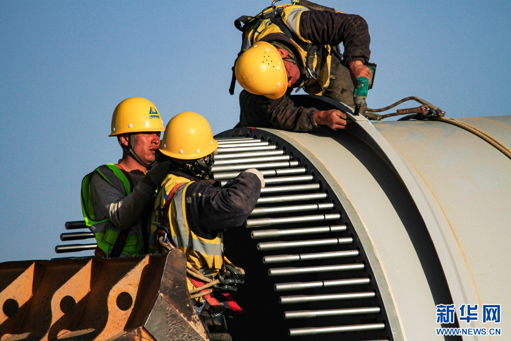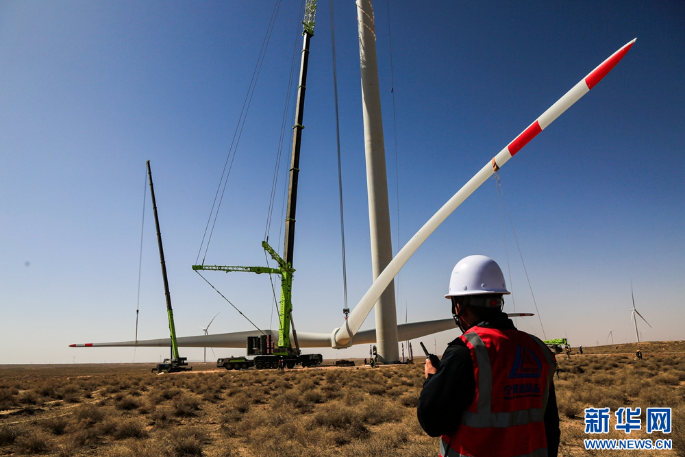 近日,在甘肅省張掖市甘州區(qū)平山湖20千瓦風電施工現(xiàn)場,工人們緊張有序地進行風電設(shè)備安裝工作。新華網(wǎng)發(fā)(陳禮 攝)