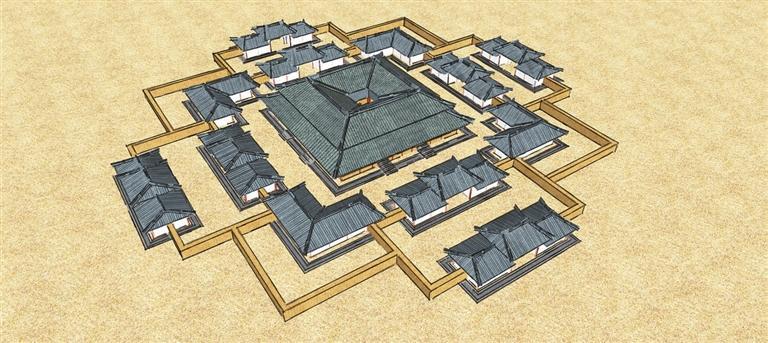 在中心夯土臺(tái)基四邊外約6.3米處平行分布有長方形附屬建筑,四角分布有曲尺形附屬建筑,對(duì)應(yīng)位置的附屬建筑結(jié)構(gòu)完全相同。長方形附屬建筑周圍有鵝卵石鋪就的散水環(huán)繞,其內(nèi)有兩個(gè)相對(duì)的方形土臺(tái),邊緣有柱洞,土臺(tái)外端中部連接夯土矮墻延伸至曲尺形建筑。四角曲尺形附屬建筑周圍亦有散水環(huán)繞,臺(tái)基邊緣有柱洞,曲尺形六邊各有一級(jí)空心磚踏步。臺(tái)基上有若干規(guī)律分布的扁平狀青石,推測(cè)應(yīng)為室內(nèi)立柱的礎(chǔ)石。曲尺形建筑的功能應(yīng)該是連接兩邊的長方形建筑,同時(shí)還要兼顧外圍次一級(jí)附屬建筑的連接。各建筑散水周圍均鋪設(shè)回紋地磚,各臺(tái)基周邊散落著瓦礫堆積。