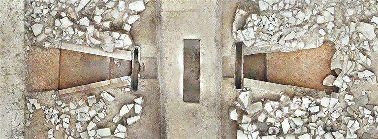 在考古發(fā)現(xiàn)中,我們注意到地磚磚縫采用了高超的填縫技術(shù),形成了密封的地面,地磚鋪設(shè)有一定坡度,使得半地穴內(nèi)地面由四邊到中部形成約0.1米的落差。地面上各處疊壓多件檐頭筒瓦和瓦當(dāng),由此可證明此半地穴空間上方露天,沒有屋檐,應(yīng)為建筑中心天井。H1北壁有一節(jié)被破壞的陶水管接口,經(jīng)解剖發(fā)現(xiàn)該陶水管向北穿過夯土高臺(tái),在其北部散水處將半地穴天井中的落水排出。半地穴空間的四壁殘留上下兩排整齊排列的鐵釘,橫向釘在夯土壁上,應(yīng)為固定壁磚之用,殘存壁磚邊緣可見填縫材料,經(jīng)檢測(cè)填縫劑為生石灰混合少量石英砂顆粒的無機(jī)質(zhì)材料,類似今天的“水泥”。