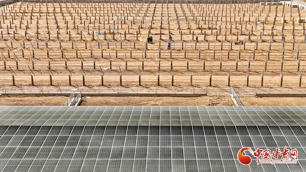 4月15日,甘肅省張掖市臨澤縣板橋鎮(zhèn)一養(yǎng)殖場(chǎng)工地上,工程建設(shè)者們正在安裝光伏板。