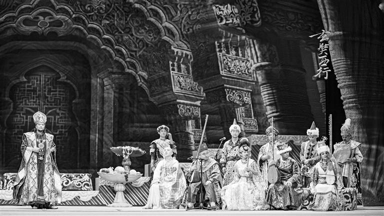 《玄奘西行》靠音樂的轉換,把人物內(nèi)心通過音樂表達出來,將人物的心理變化賦予戲劇張力。姜瑩給甘肅省歌舞劇院演出的《玄奘西行》專門配了一版交響樂的伴奏,希望通過交響樂把底子鋪好,通過交響樂和民樂的融合達到氣勢恢宏的效果。