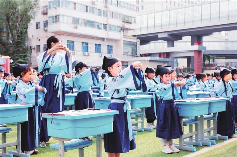中國甘肅網(wǎng)9月2日訊 據(jù)蘭州晨報(bào)報(bào)道(奔流新聞·蘭州晨報(bào)記者裴強(qiáng)) 8月30日,蘭州市七里河教育集團(tuán)為七里河小學(xué)和中車分校的600名一年級新生舉行入學(xué)“開筆禮”儀式。開筆禮在中國傳統(tǒng)文化中是對少兒識(shí)字習(xí)禮的稱謂,是標(biāo)志少兒進(jìn)入學(xué)習(xí)階段的重要紀(jì)念,是中國古代人生的首次大禮,孩子將要入學(xué)讀書寫字、習(xí)禮之時(shí)的一個(gè)傳統(tǒng)禮節(jié)。兩所學(xué)校600名一年級新生“端正衣冠”“感恩先賢”“朱砂啟智”“擊鼓鳴志”“啟蒙描紅”,體驗(yàn)傳統(tǒng)“開筆禮”儀式。