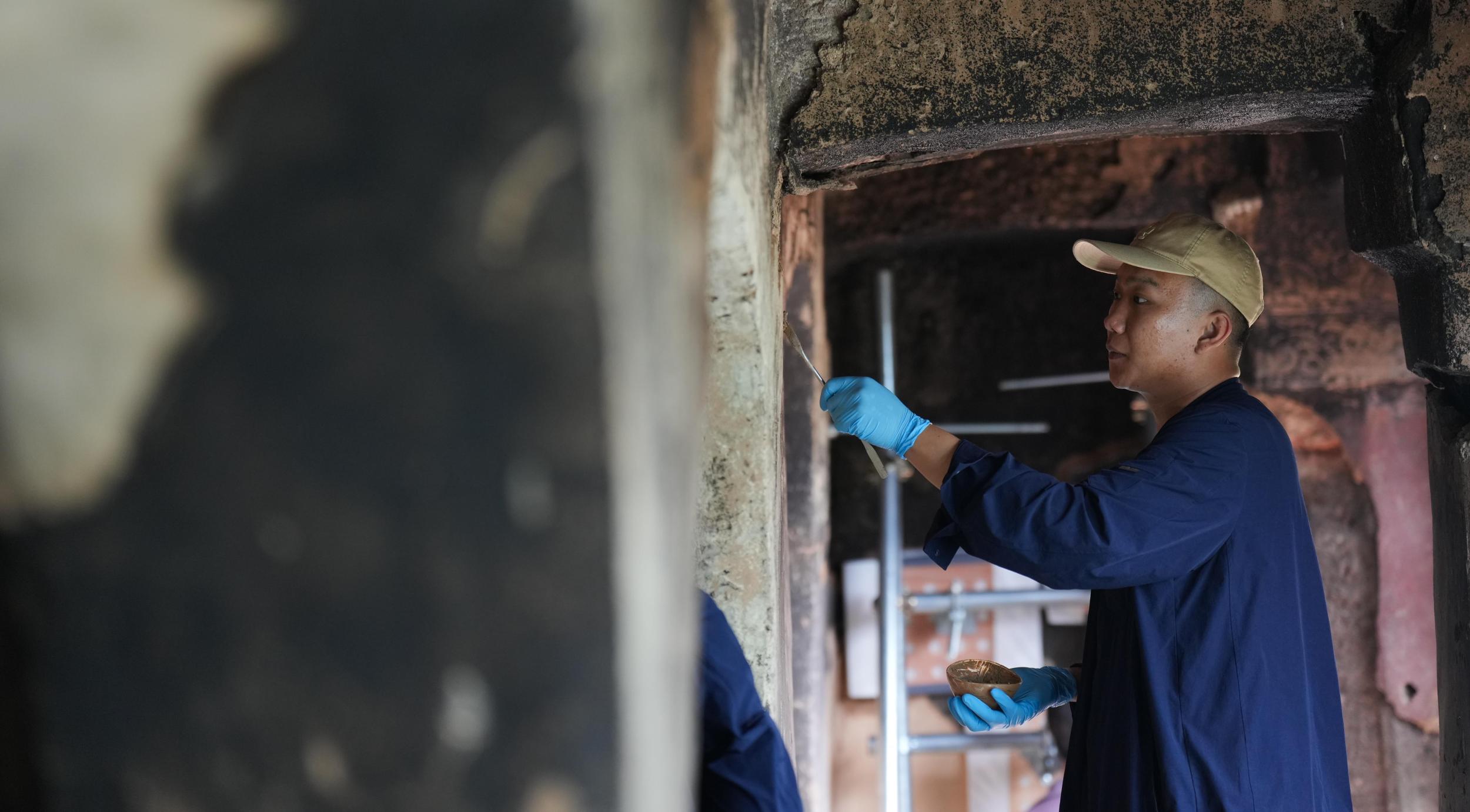 △工作人員對麥積山石窟進行保護修繕。(總臺國廣記者李晉拍攝)
