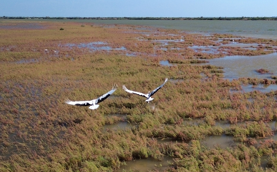 我們這里是中國東方白鸛之鄉(xiāng)、黑嘴鷗繁殖地,去年以來還新發(fā)現(xiàn)了火烈鳥、白鵜鶘、勺嘴鷸。”當?shù)刎撠熗窘榻B,這些年通過退耕還濕、退養(yǎng)還灘,推進濕地修復,生態(tài)環(huán)境越來越好。