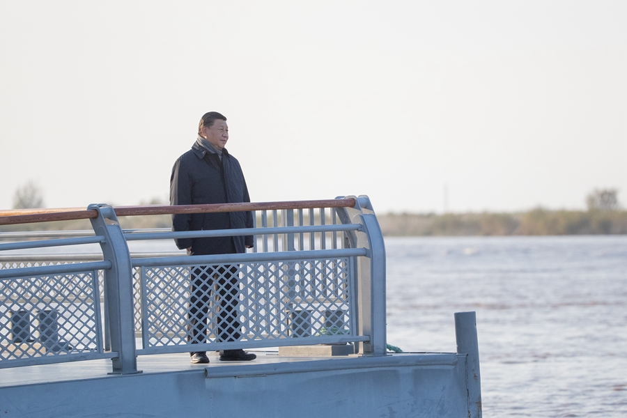 2021年10月20日,中共中央總書記、國家主席、中央軍委主席習近平在東營市黃河入海口考察。新華社記者王曄攝