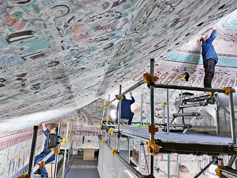 圖為2024年拍攝的莫高窟第55窟文物修復(fù)現(xiàn)場(chǎng)。來(lái)源:敦煌研究院供圖
