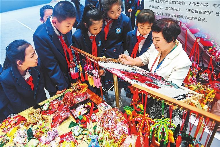 9月22日,慶陽香包刺繡展位非遺傳承人給孩子們展示刺繡技藝。新甘肅·甘肅日報記者丁凱