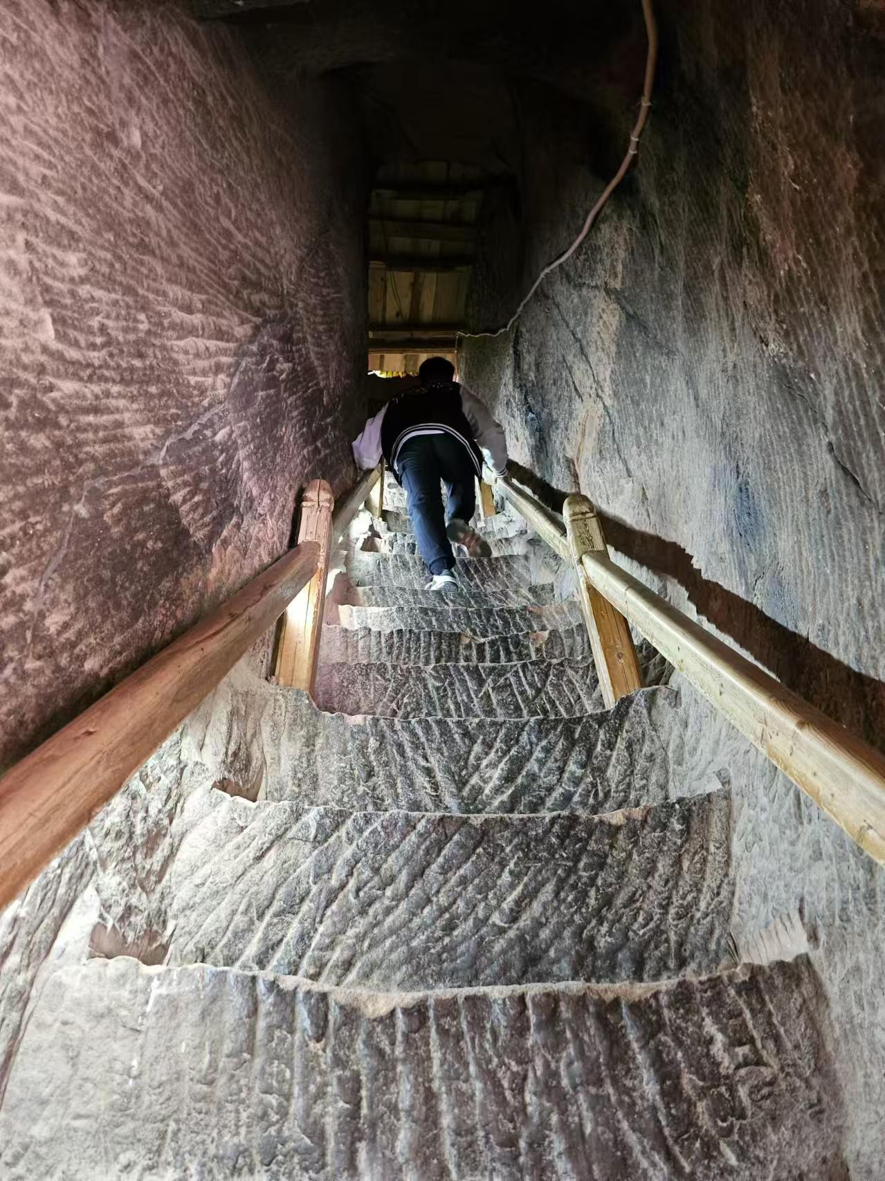 由第一層的北邊入內(nèi),隧道呈“之”字形,回廊曲折。里邊只能容納一個(gè)人行走,兩個(gè)人并坐,一共上去有129個(gè)臺(tái)階。石窟中的石砌臺(tái)階百轉(zhuǎn)千回,高低不一,不少階梯需要手腳并用才能上去,其艱難程度激發(fā)了游客的攀登欲,也有了“不到長(zhǎng)城非好漢,不登三十三天真遺憾”的說(shuō)法。