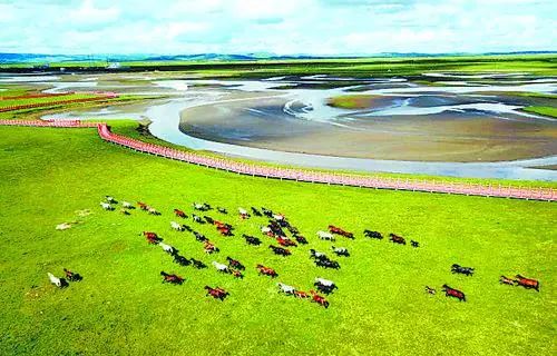 在這片濕地上,黃河的支流蜿蜒曲折,形成各式各樣的曲線。陽光下,這些彎彎曲曲的大小沼澤,猶如一條條銀色的絲帶,閃閃發(fā)光。觸手可及的藍天白云無際無涯,像洗滌過似的,亮得耀眼,牛羊滿山坡,宛如散落在人間的珍珠。這種原始的自然美景和豐富的生態(tài)資源,讓阿萬倉濕地成為一個理想的旅游目的地。