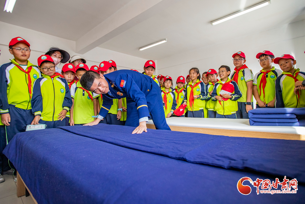 消防隊員正在為師生們展示內(nèi)務(wù)整理