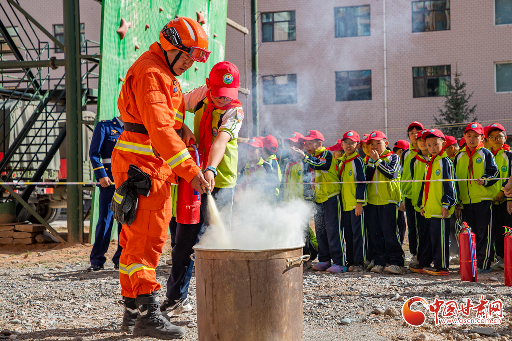 消防隊員正在協(xié)助學生進行干粉滅火器的使用