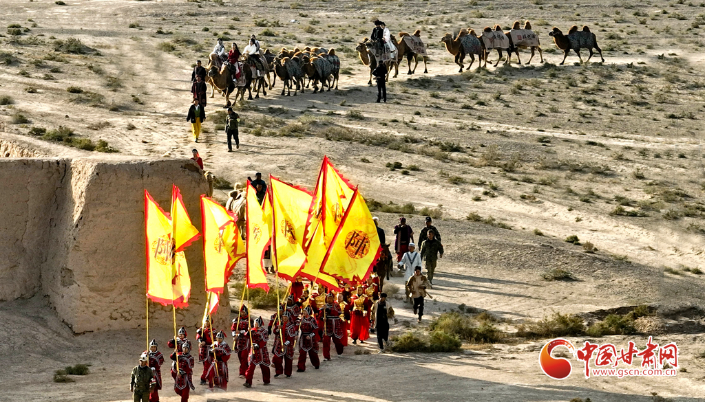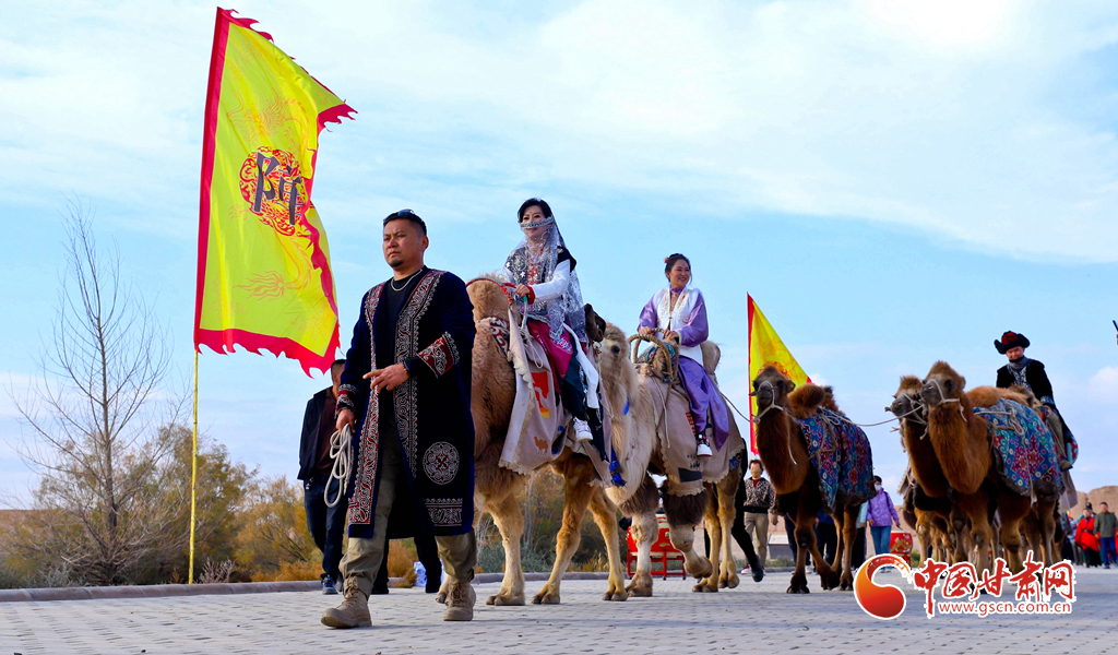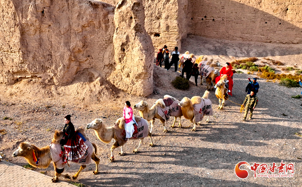 10月9日,一隊(duì)由33峰駱駝組成的駝隊(duì)行進(jìn)在高臺(tái)縣境內(nèi)的絲綢之路大型漢唐古文化遺址——駱駝城遺址內(nèi),千年駱駝城又響起陣陣駝鈴聲。