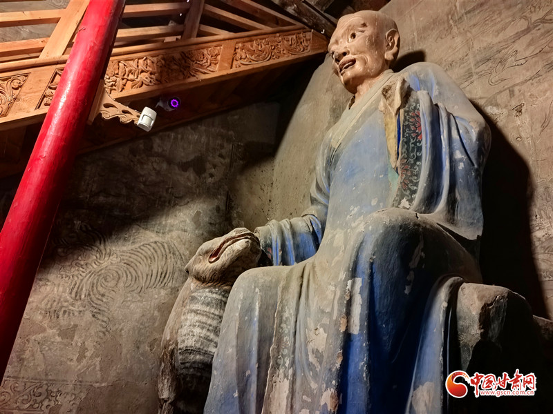 為何要將老虎塑造得如此乖巧?答案就在老虎旁邊的壁畫中。壁畫里的老虎張牙舞爪、張著大嘴,盡顯兇猛之態(tài)。而羅漢手中的老虎卻溫順如貓,這一鮮明對比,恰恰生動地說明了羅漢已將老虎降服。