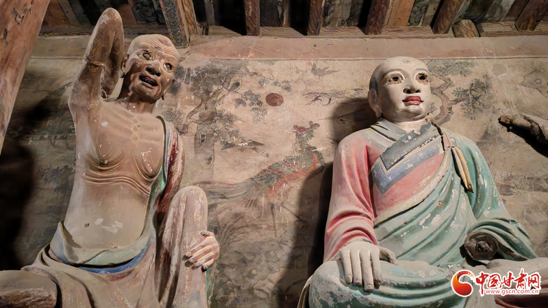 順著羅漢目視的方向望去,龍盤踞于房梁之上,若參照龍背后的壁畫,又仿佛這條龍正翱翔于天空之上。這一獨特設(shè)計,源于張掖大佛寺深厚的歷史背景。
